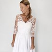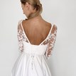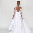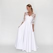 Krásne svadobné šaty Domi tvorí kombinácia čipky a lesklého saténu v snehovo-bielom odtieni. Živôtik je prekrývaný. Základná spodná vrstva je korzetová, so srdiečkovým výstrihom a praktickým zadným viazaním. Pokrýva ho priehľadný tyl ozdobený čipkou, s decentným V-výstrihom, hlbším výstrihom na chrbte a 3/4 rukávmi. Skladaná sukňa je hladká, nezdobená, pekne nariasená. V zadnej časti je veľmi jemne predĺžená, ak by vám však táto krátka vlečka vadila, dá sa veľmi šikovne vypnúť. Šaty vyzerajú veľmi elegantne, romanticky, sú úplne nové. Zapínajú sa v zadnej časti na spomínané viazanie.