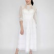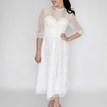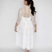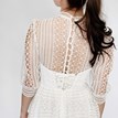 Svadobné/Popolnočné šaty Ella od značky Licor oslovia nevestu, ktorá túži po nenútenej kráse s boho nádychom. Celé čipkované prevedenie s 3/4 rukávmi a dĺžkou po kolená pôsobí decentne, no zároveň originálne. Korzet so srdiečkovým výstrihom, ukrytý pod jemnou čipkou, vytvára detail, ktorý nevestu zaujímavo zvýrazní aj bez okázalých výstrihov. Svadobné šaty sú ľahké, pohodlné a ozdobia vás aj bez potreby ďalších doplnkov. Gombíkové zapínanie na chrbte dodáva šatám vintage šmrnc. Tieto svadobné šaty sú ideálnou voľba pre nevestu, ktorá sa cíti krásne práve v jednoduchosti.
