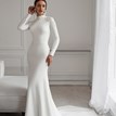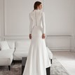 Svadobné šaty Aisha od značky Vissaria v odtieni jemnej off white sú stvorené pre nevestu, ktorá chce vyzerať elegantne, žensky a neprehliadnuteľne. Vyrobené z elastického materiálu krásne obopínajú postavu a zdôrazňujú krivky bez straty komfortu. Dlhé rukávy s jemnou čipkou a zdobením z kamienkov na ramenách dodávajú šatám rafinovaný lesk. Hoci nemajú výstrih, vďaka prepracovanému strihu a priliehavému dizajnu pôsobia mimoriadne zvodne. Gombíky na chrbte podčiarkujú celkový dojem elegancie. Krátka vlečka s úchytom na prst zabezpečí pohodlie pri chôdzi. Výrazné, nadčasové šaty pre modernú nevestu.