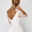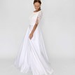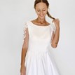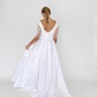 Krásne svadobné šaty Bára sú po celej dĺžke vyhotovené z bieleho saténu s vysokým leskom. Živôtik je decentný, má lodičkový výstrih s vnútornými košíčkami, príjemný V-výstrih na chrbte a hladkú nariasenú sukňu s podšívkou. Túto elegantnú základnú časť šiat dopĺňajú priehľadné 3/4 rukávy s romantickým zdobením z perličiek a transparentných koráliek a flitrových aplikácií. Zapínajú sa vzadu na kombináciu zipsu a viazania. Sú ideálne pre jemnú nevestu, ktorá má rada krásnu čistú jednoduchosť!