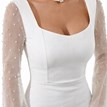 Elegantné šaty Perlinka patria medzi jednoduché minimalistické kúsky, ktoré ozvláštňujú prekrásne dlhé rukávy ozdobené perličkami. Sú priehľadné vďaka jemnému tylu a navyše aj pohodlné, nakoľko sa rozširujú do tvaru zvonca. Šaty majú ženskú siluetu Fit & Flare, krásne lemujú oblasť pásu, bokov a nakoľko majú rázporok, dokážete sa v nich úplne bez problémov pohybovať. Sú elastické, úžasne sa prispôsobia postave. Zapínajú sa vzadu jednoducho na zips.