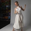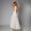 Saténové šaty Brianna sú určené na letnú svadbu ako hlavný svadobný alebo popolnočný model. Majú zavinovací živôtik na viazanie, odhalenú chrbtovú časť, odnímateľný opasok a štýlovú plisovanú midi sukňu. Šaty sú podšité, zapínajú sa na skrytý zips.
