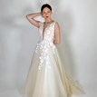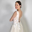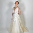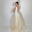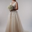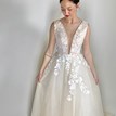 Princeznovské svadobné šaty v nádhernom broskyňovom odtieni sú zaujímavé práve vďaka svojmu zafarbeniu, ktoré má zjemňujúci charakter. Nevesta v nich vyzerá láskavo, romanticky a nežne. Na broskyňovom základe kontrastne vyniká biela kvetinová čipka, ktorá je ručne všívaná na živôtiku a tiahne sa aj do vrchnej vrstvy sukne. Živôtik lemovaný malými perličkami je pomerne odvážny. Má hlboký končitý výstrih vyplnený telovým tylom a hlboký výstrih na chrbte s viazaním, vďaka ktorému si môžete korigovať veľkosť podľa potreby. Štítkovo je veľkosť šiat 40, no spomínaná viazačka vie šaty prispôsobiť konfekčnej veľkosti 38 aj 42. Sukňa je naozaj princeznovská, má 9 ľahkých vrstiev a ťahavú vlečku na vypnutie. Svadobné šaty sa zapínajú v zadnej časti na zips, sú neuveriteľne ľahké a pohodlné :)